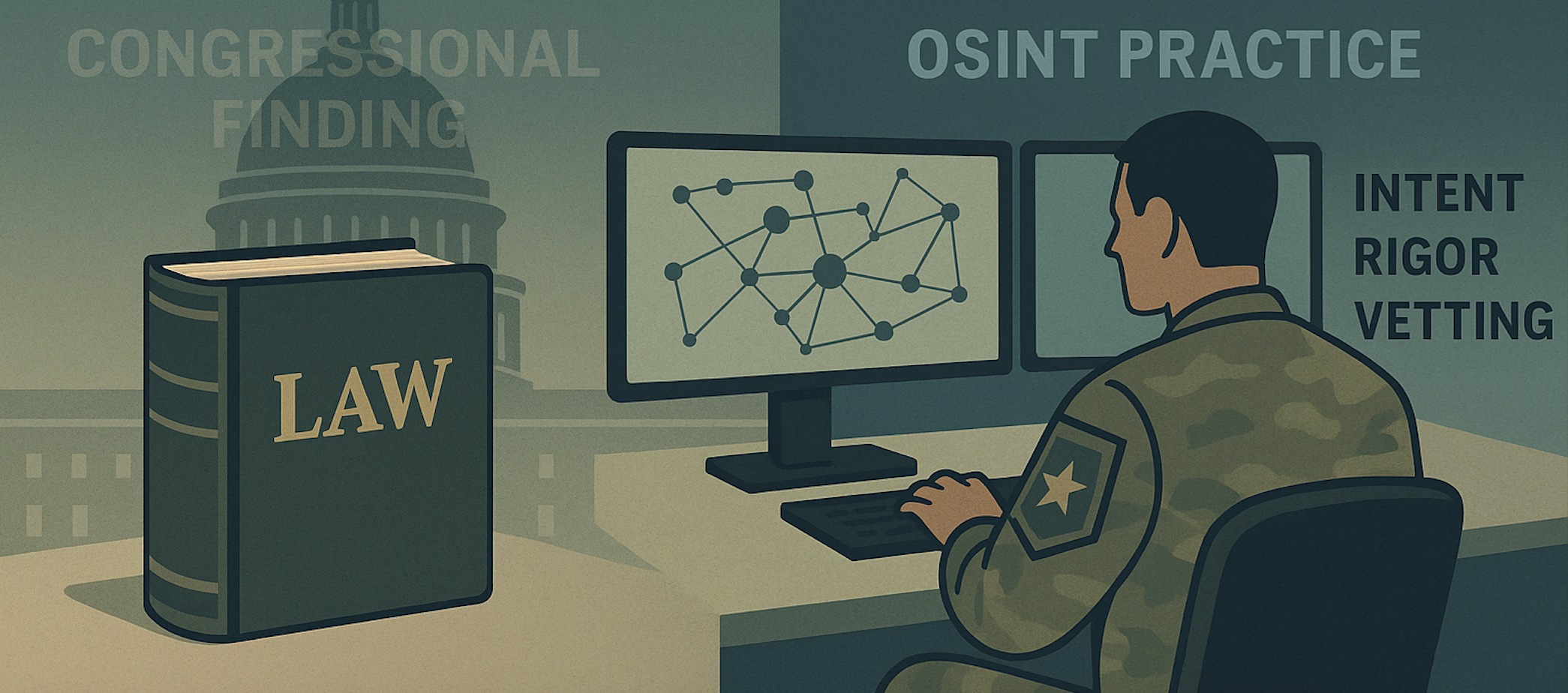 This definition first appeared in the 2006 National Defense Authorization Act[ii] and was later amended to Title 50 of the U.S. Code.[iii] Many interpret the definition’s presence in U.S. Code as a legally binding mandate. The intent of the public law, however, was to prompt the Secretary of Defense to develop a strategic framework for, “integrating OSINT into the Defense intelligence process.” [iv] Congressional findings are considered prefatory—they provide context but do not carry independent legal force. [v] The definition of OSINT appears in the law only as a “congressional finding” which provided context leading into the legally binding text. According to the Library of Congress: